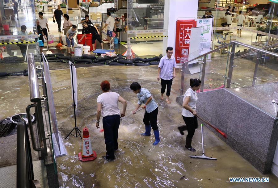 Staff of a shop drain the floodwater in Haikou, south China's Hainan Province, Aug. 10, 2018. Hainan was hit by heavy rainfalls under the influence of a tropical depression on Friday, which triggered a red alert for rainstorms in seven cities and counties, including Haikou. (Xinhua/Wang Junfeng)