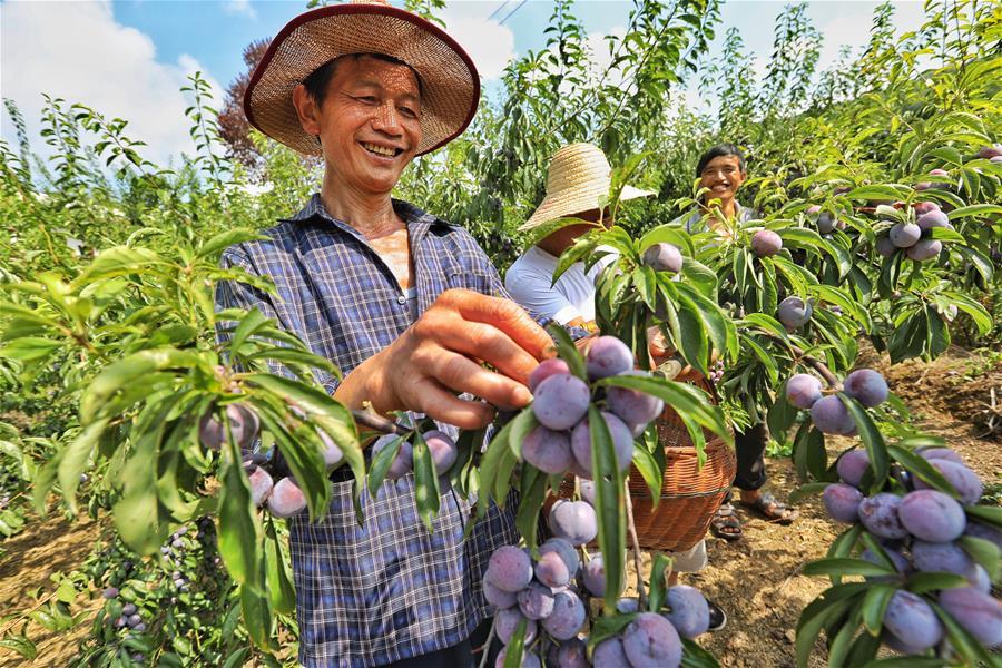 Farmers pick plums at Hongxing Village of Pingzheng Township in Zunyi, southwest China's Guizhou Province, Aug. 12, 2018 (Xinhua/Liu Xu)
