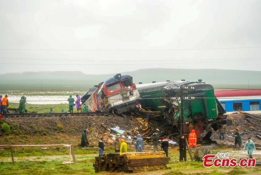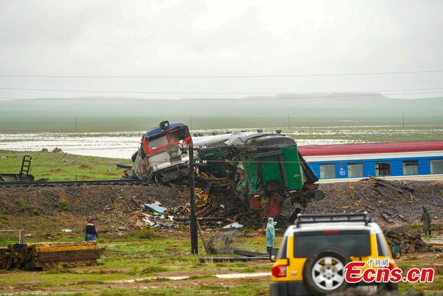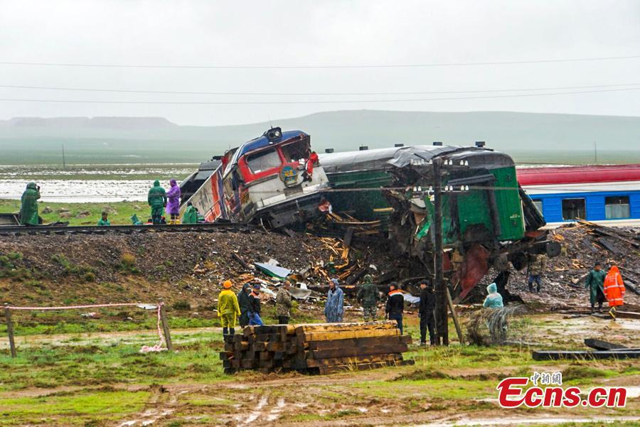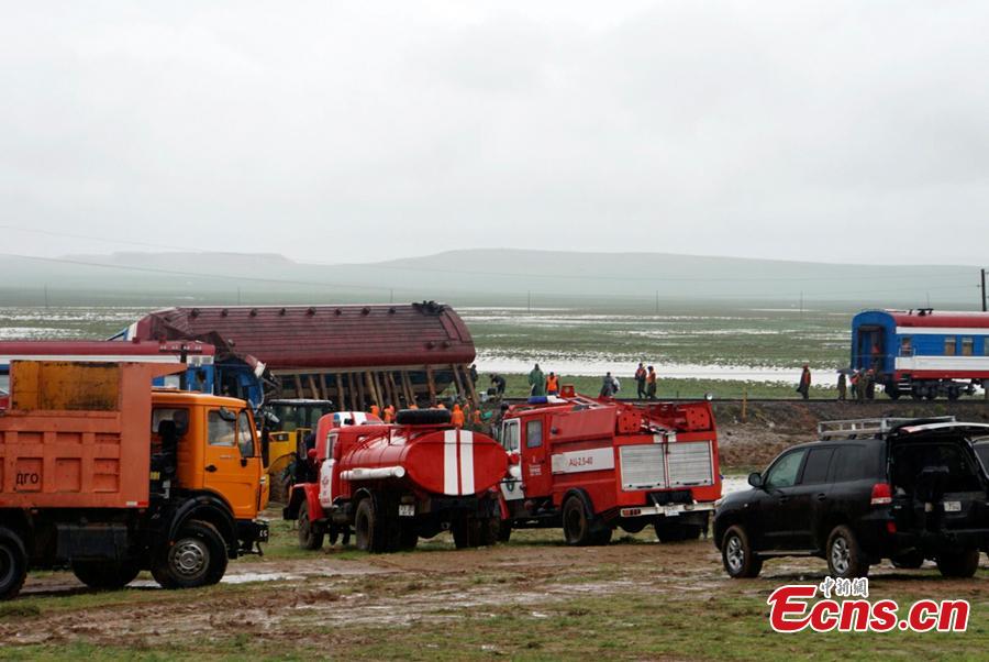 Rescuers work at the site where a train carrying 328 passengers derailed in Dornogovi Province, Mongolia. The train was traveling from the Mongolian capital Ulan Bator to Zamiin-Uud soum in the southeastern province of Dornogovi. There are reports of many injuries. (Photo: China News Service/Luo Ziteng and Ren Yi)