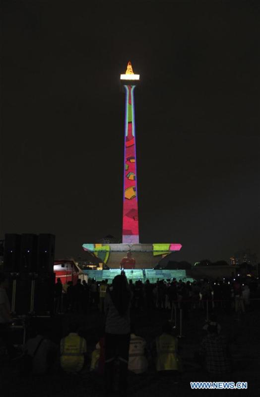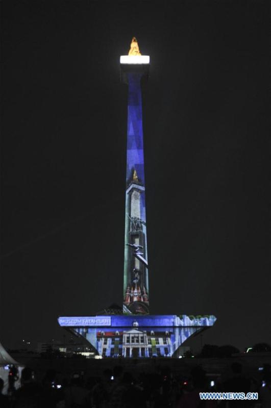 A video mapping work is projected on the facade of the National Monument also known as Monas to welcome the Asian Games in Jakarta, Indonesia, Aug. 13, 2018. (Xinhua/Zulkarnain)