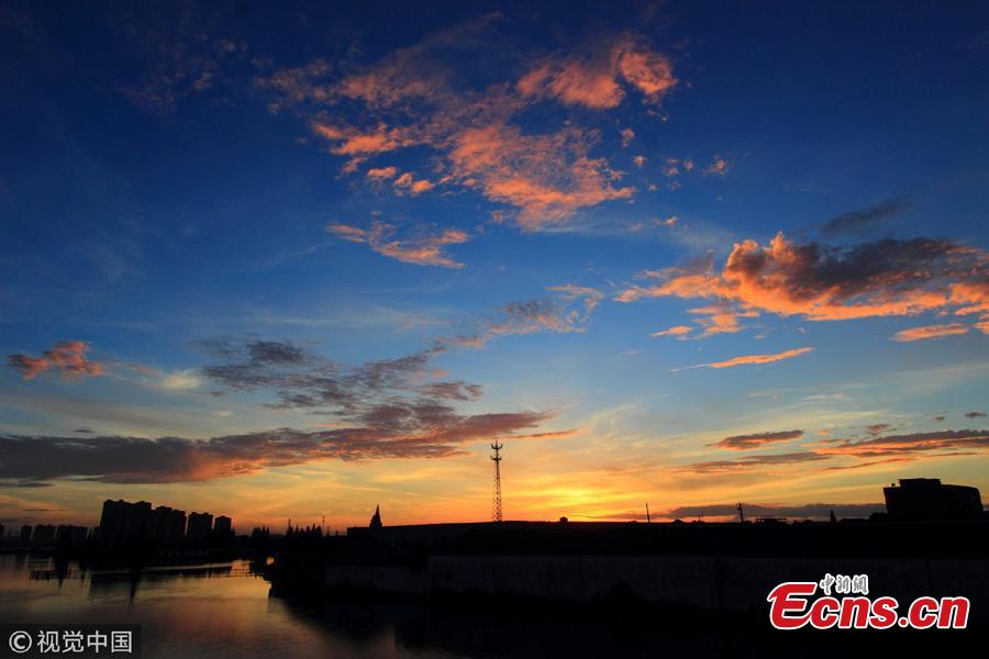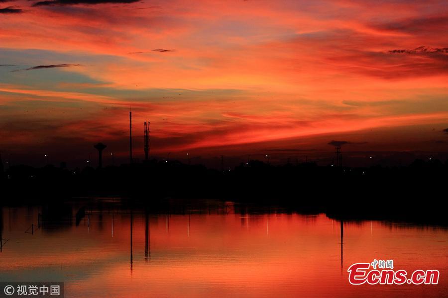 Crimson clouds at sunset hang over the sky in Shaoxing City, Zhejiang Province, Aug. 14, 2018, after the typhoon Yagi. (Photo/VCG)