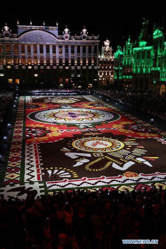 Photo taken on Aug. 16, 2018 shows the night view of a carpet of more than 500,000 flowers at the Grand Place in Brussels, Belgium. A carpet of over 500,000 flowers was unrolled Thursday at central Brussels' Grand Place. The carpet, measuring 75 meters by 24 meters, is mainly composed of begonias and dahlias. It took some 100 volunteers about eight hours to assemble the giant floral puzzle. (Xinhua/Wang Xiaojun)