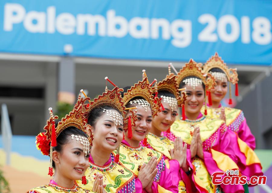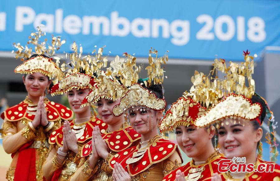 Indonesian girls don traditional costumes to attend flag-raising ceremonies at the Asian Games Village ahead of the 18th Asian Games in Jakarta, Indonesia, on Aug. 16, 2018. (Photo: China News Service/Liu Guanguan)