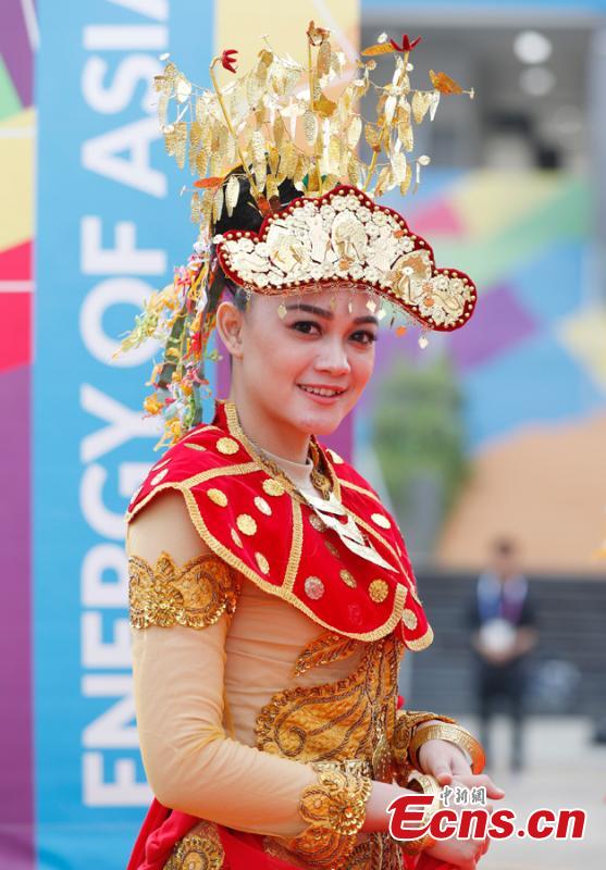 An Indonesian girl dons traditional costumes to attend flag-raising ceremonies at the Asian Games Village ahead of the 18th Asian Games in Jakarta, Indonesia, on Aug. 16, 2018. (Photo: China News Service/Liu Guanguan)