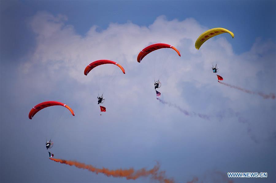 Photo taken on Aug. 19, 2018 shows paramotor performance during the 7th Faku Flight Conference in Shenyang, capital of northeast China's Liaoning Province. (Xinhua/Yao Jianfeng)