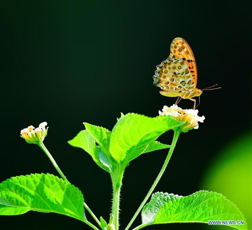A moth flies among flowers at the Wenquan Park in Fuzhou, capital of southeast China's Fujian Province, Aug. 18, 2018. (Xinhua/Mei Yongcun)