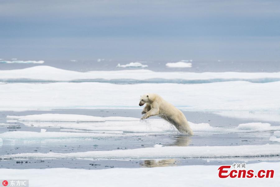 A polar bear crosses thin and breaking pieces of ice which is melting away in the hot summers. (Photo/IC)