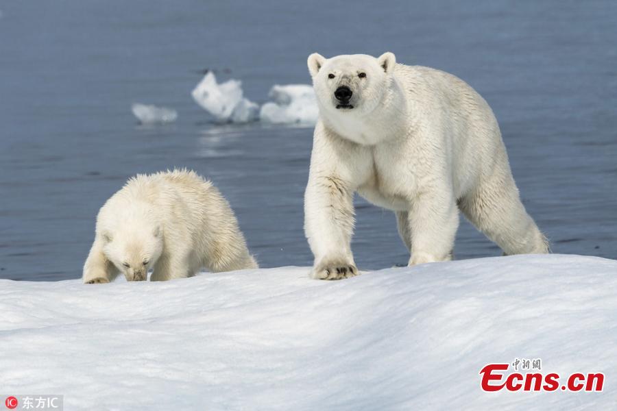 A ground-level view of polar bears in the north of Canada where a small block of ice is surrounded by water. (Photo/IC)