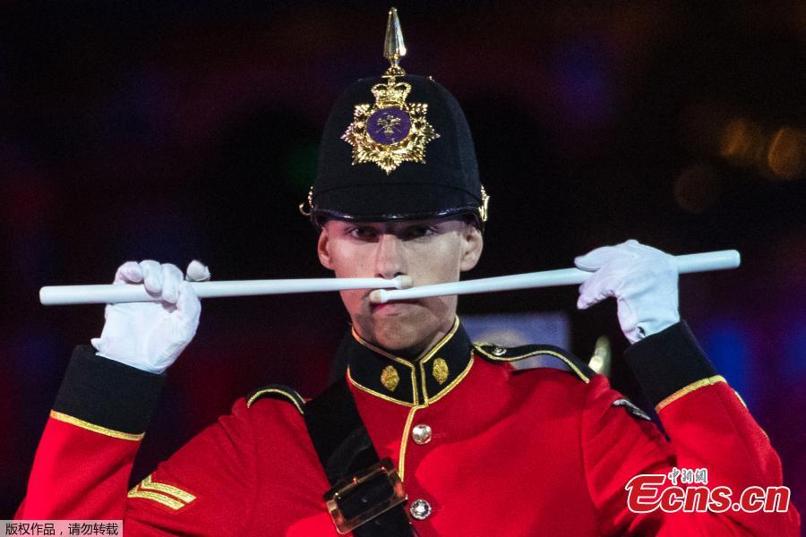 Members of the Russian Honor Guard of the Presidential Regiment perform during a rehearsal of the Spasskaya Tower international military music festival in Red Square, in Moscow, Russia, Aug. 23, 2018, with the Saint Basil's Cathedral in the background. (Photo/Agencies)