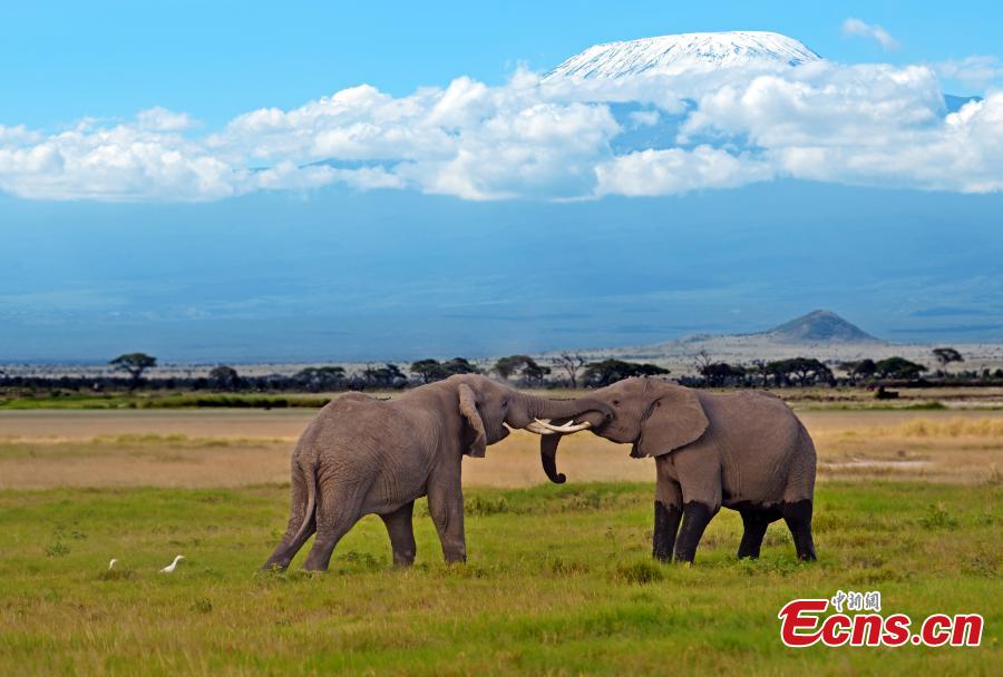 Elephants wander on the plain as the snow covered peak of Mount Kilimanjaro rises above them in the background, Amboseli National Park, Kenya. (Photo provided to China News Service)