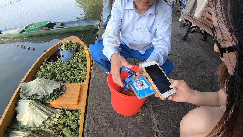 A young woman uses Alipay to buy lotus heads and leaves. (Photo/China Daily)