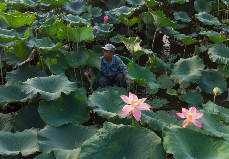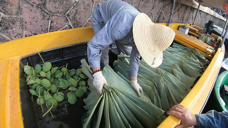 In summer, their job is to sail into the forest of lotuses, which grow to a height of about 1 meter above the water, on a hand-paddled boat with just a single seat to remove excess leaves to provide more room for the plants to grow.