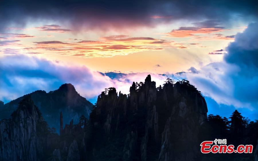 A spectacular sunrise in Mount Huangshan scenic area in Anhui Province, Aug. 30, 2018. Rolling mist between the valleys and crimson clouds created an amazing natural wonder. (Photo: China News Service/Liu Hao)