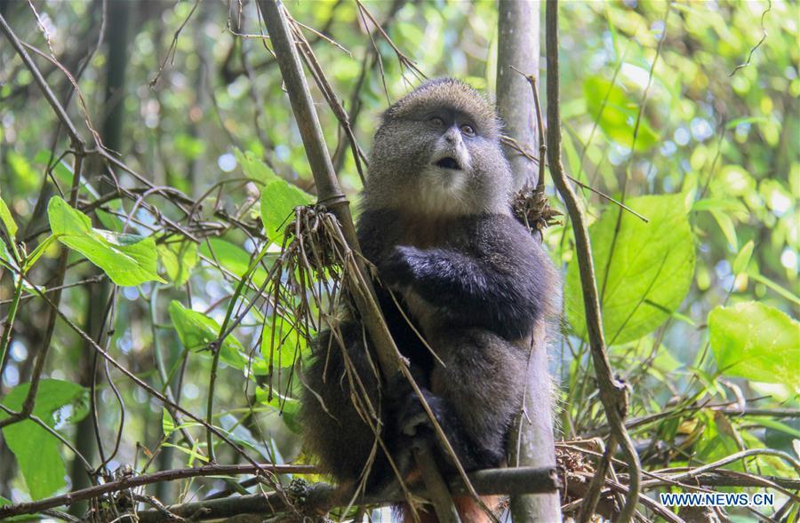 A golden monkey stays in the forest in Volcanoes National Park, northwestern Rwanda, on Dec. 25, 2017. (Xinhua/Lyu Tianran)
