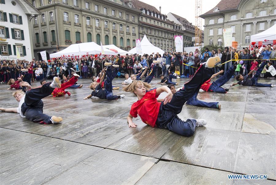 Local teenagers perform Chinese martial arts during the "Meet China" event in Bern, Switzerland, Sept. 1, 2018. The cultural event "Meet China" was held here on Saturday to offer local residents an opportunity to experience Chinese culture. (Xinhua/Xu Jinquan)