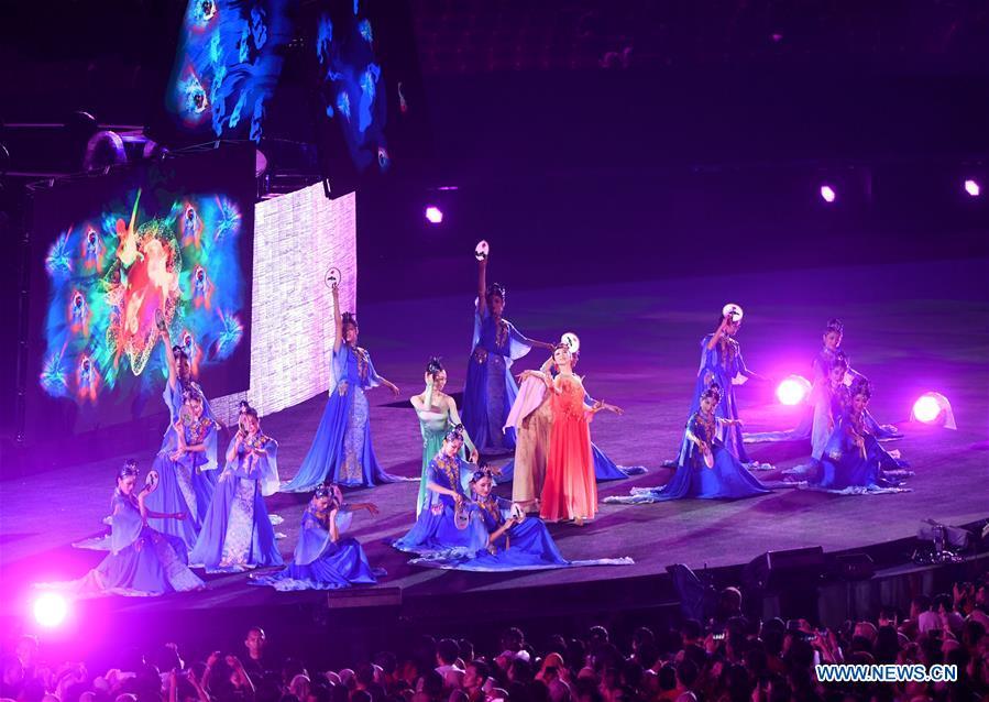 Photo taken on Sept. 2, 2018 shows the "Hangzhou Time" cultural performance during the closing ceremony of the 18th Asian Games at the Gelora Bung Karno (GBK) Main Stadium in Jakarta, Indonesia.(Xinhua/Lan Hongguang)