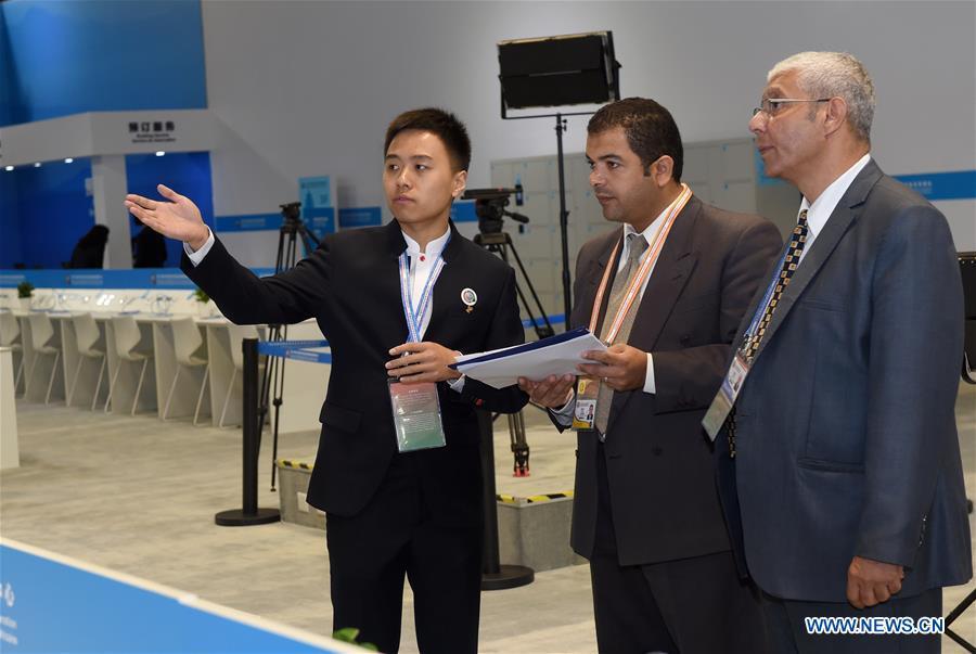 Guo Xu (1st L), a volunteer from Beijing University of Posts and Telecommunications, introduces to two Egyptian journalists about the media center for the Beijing Summit of the Forum on China-Africa Cooperation (FOCAC) in Beijing, capital of China, Sept. 3, 2018. The FOCAC Beijing Summit involves some 2,500 volunteers, most of whom are students from 32 higher education institutions. The volunteers are mainly responsible for tasks in venue services, guest reception, registration, media services and transportation. (Xinhua/Luo Xiaoguang)