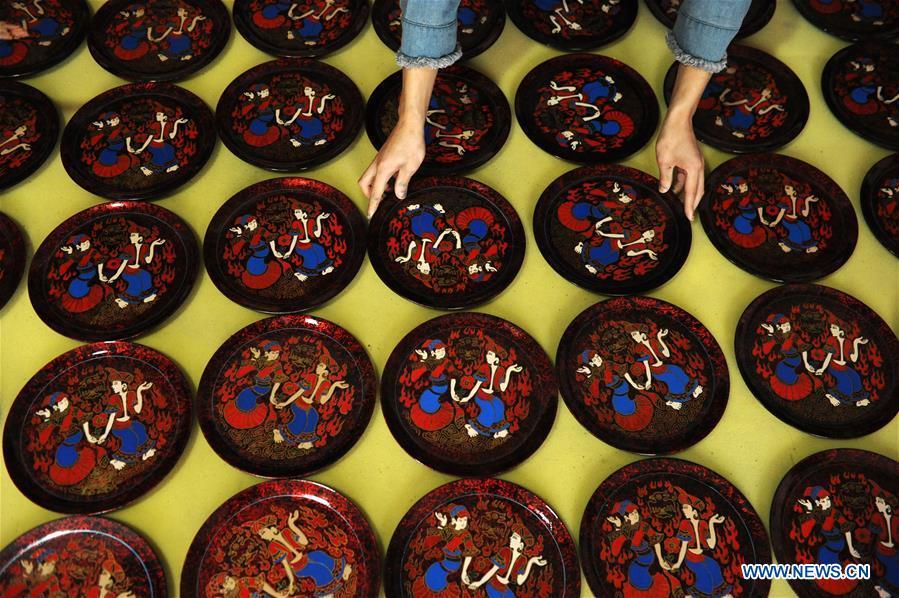 Lacquerworks are seen at a factory in Dafang County, southwest China's Guizhou Province, Sept. 10, 2018. The lacquerwork produced in Dafang County is handmade through all the procedures and requires high standards. The making technique can only be get from experienced craftsman. Nowadays, local government has set up studios and introduced the artwork to online shops for the inheritance of the art. (Xinhua/Yang Wenbin)