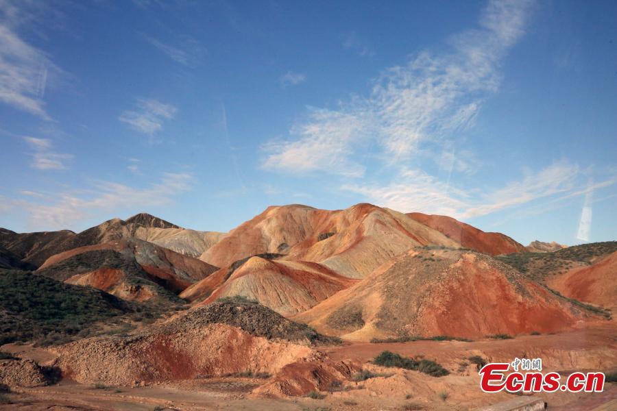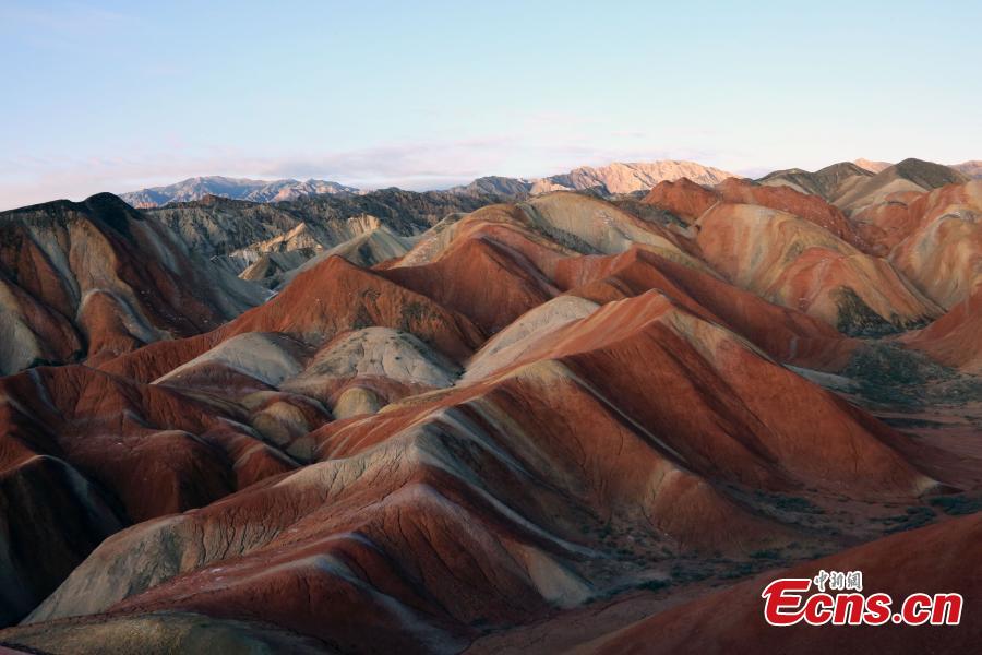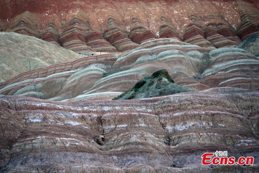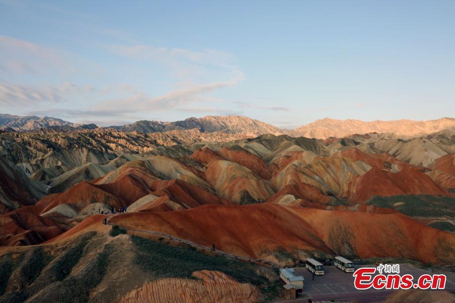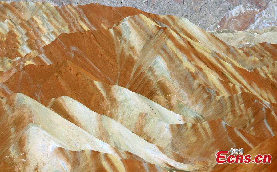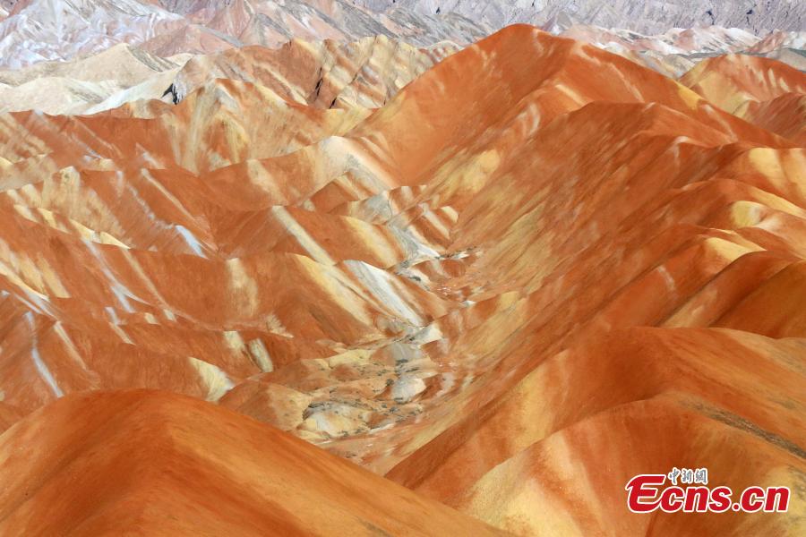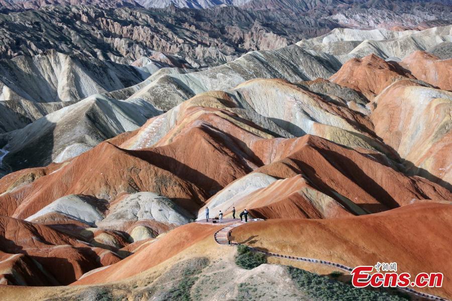 The colorful Danxia landform group, located in Zhangye City, Northwest China’s Gansu Province. At an average elevation of 1850 meters, the Danxia landform stretches east to west for 45 kilometers and north to south for 10 kilometers. More than a famous tourist attraction, the Danxia landform has been featured in a number of movies. (Photo: China News Service/Ren Haixia)