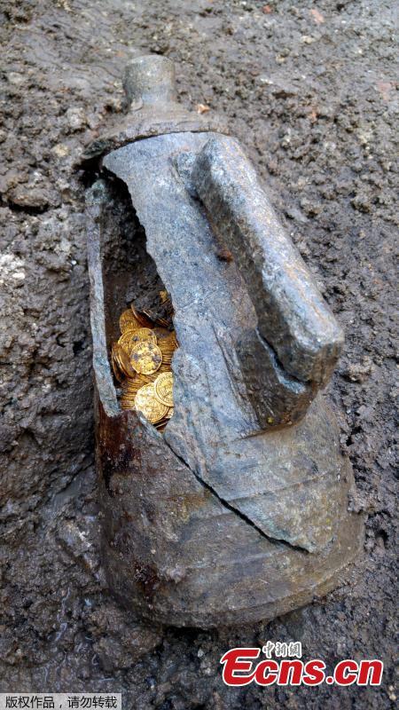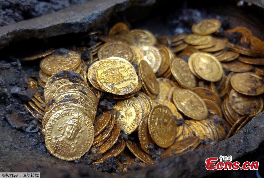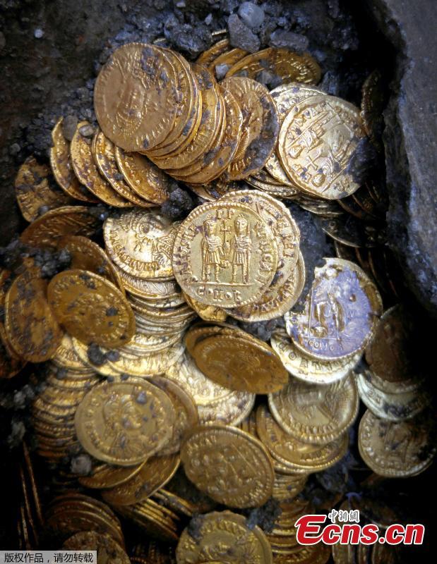 About 300 Roman-era gold coins were unearthed beneath what once was an Italian theater. The rare treasure was found by construction workers building an apartment complex at the previous site of the historic Cressoni Theater in northern Italy, which closed in the 1990s. What appears to be a soapstone vase or jar held the coins, believed to be from 474 B.C. (Photo/Agencies)