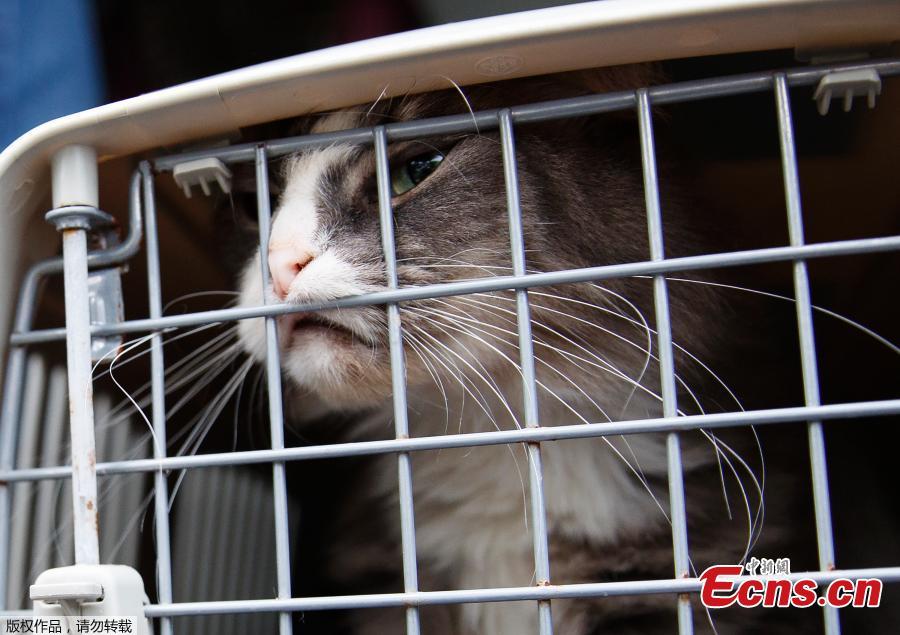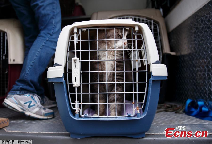 A long-haired tabby cat pushes against the crate door during the unloading of 26 cats and dogs from a van at Humane Rescue Alliance in Washington, Sept. 11, 2018, from Norfolk Animal Care and Control of Norfolk, Va., in advance of Hurricane Florence. People aren't the only ones evacuating to get out of the path of Hurricane Florence. The dogs and cats will all be available for adoption. (Photo/Agencies)