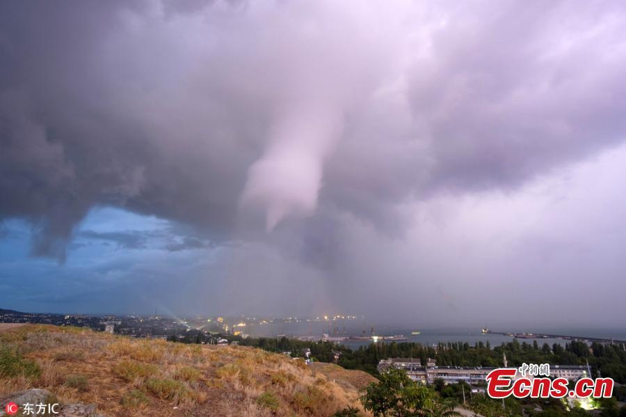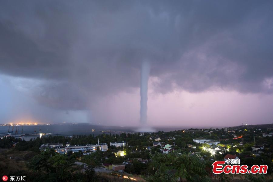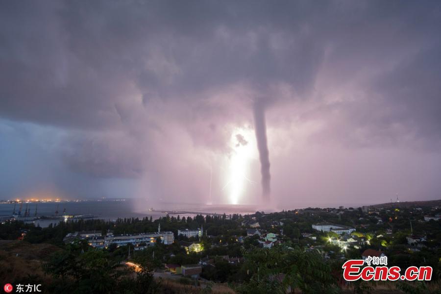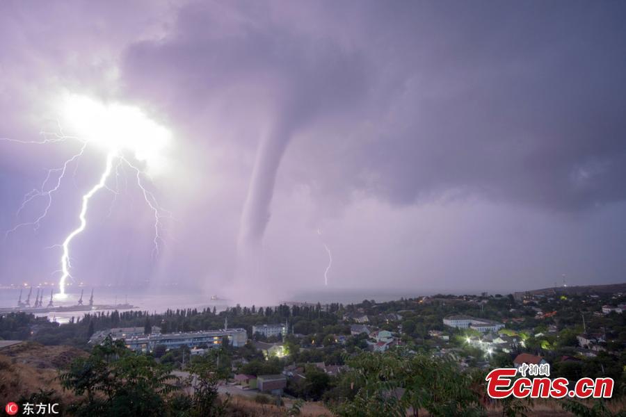 Photo taken by Andrei Sheliakin shows the rare tornadic waterspout in Crimea amid lightning. (Photo/IC)