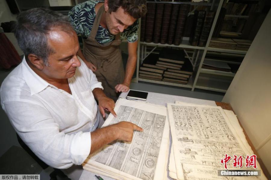 Italian Egyptologue Francesco Tiradritti (L) and Italian conservator-restorer Simone Martini look at the Thesaurus Hyeroglyphicorum book at the Ajaccio library on the French Mediterranean Island of Corsica, Sept. 7, 2018. (Photo/Agencies)