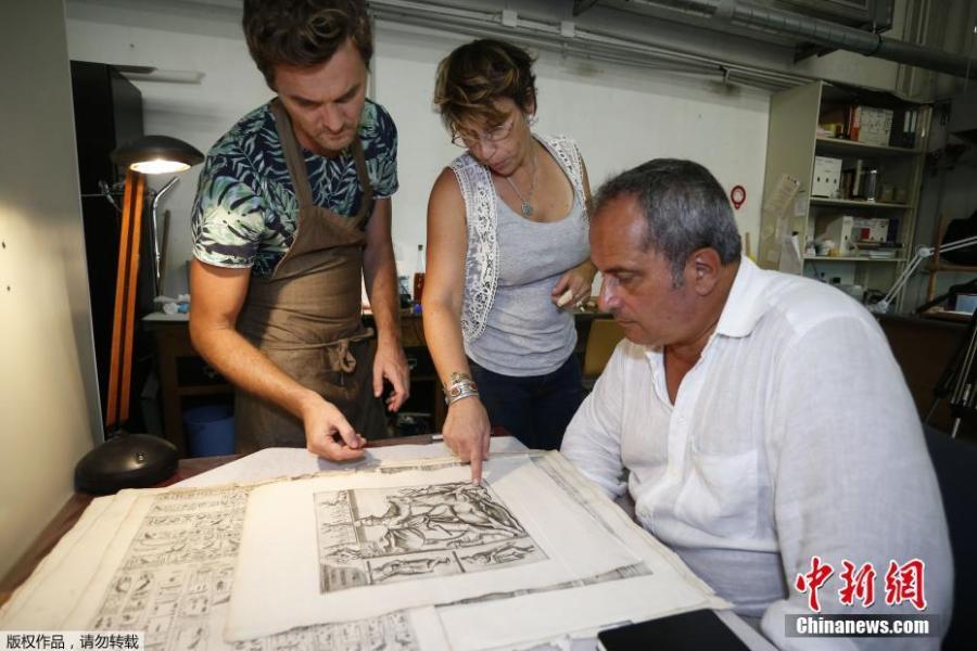 Italian Egyptologue Francesco Tiradritti (R), Vannina Schirinski-Schikhmatoff (C) in charge of the Ajaccio library restauration and conservation mission and Italian conservator-restorer Simone Martini look at the Thesaurus Hyeroglyphicorum book at the Ajaccio library on the French Mediterranean Island of Corsica, Sept. 7, 2018. (Photo/Agencies)