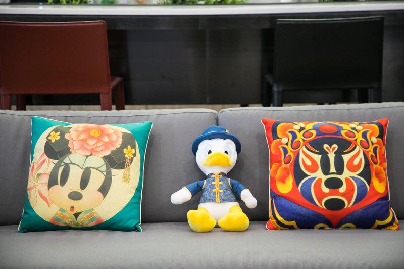 Chinese influences are seen in these Disney items, from left, a Minnie Mouse pillow, Donald Duck stuffed toy and Mickey Mouse pillow. (Photo provided to chinadaily.com.cn)