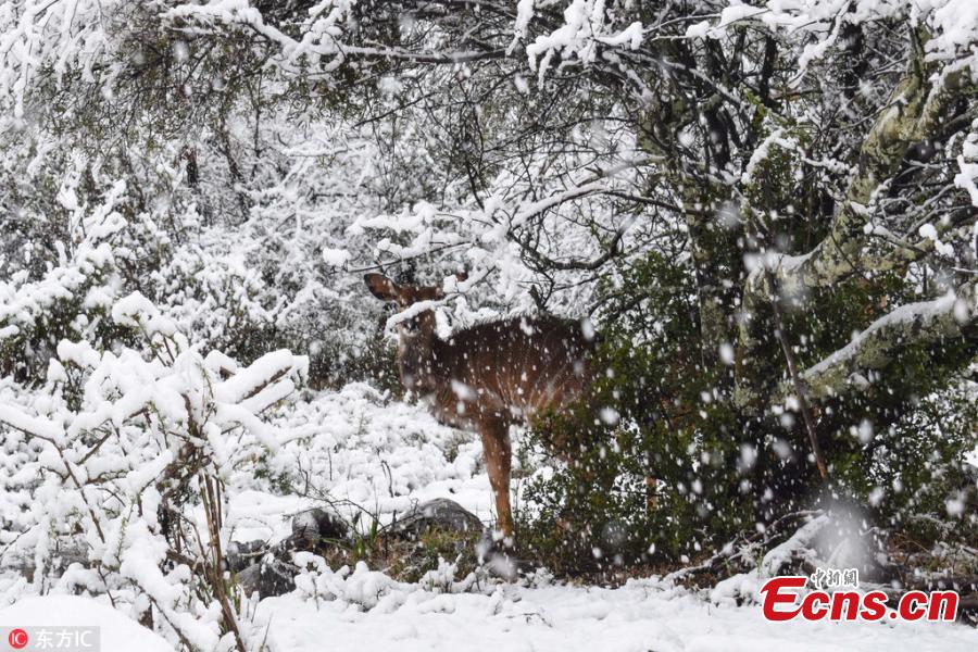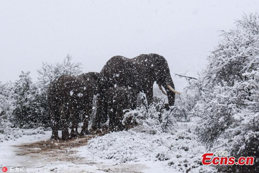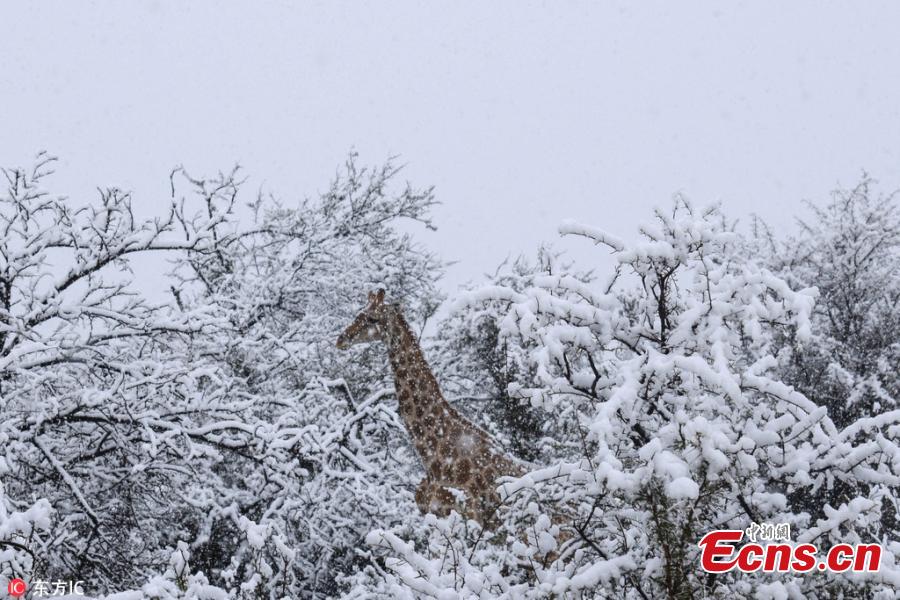 Kitty Viljoen, who lives in Eastern Cape, captured images of giraffes, lions, elephants and wildebeest making their way through the wintry landscape after South Africa experienced an unexpected cold snap. (Photo/IC)