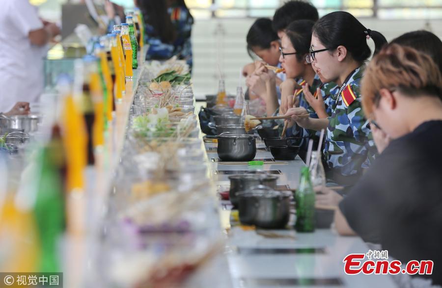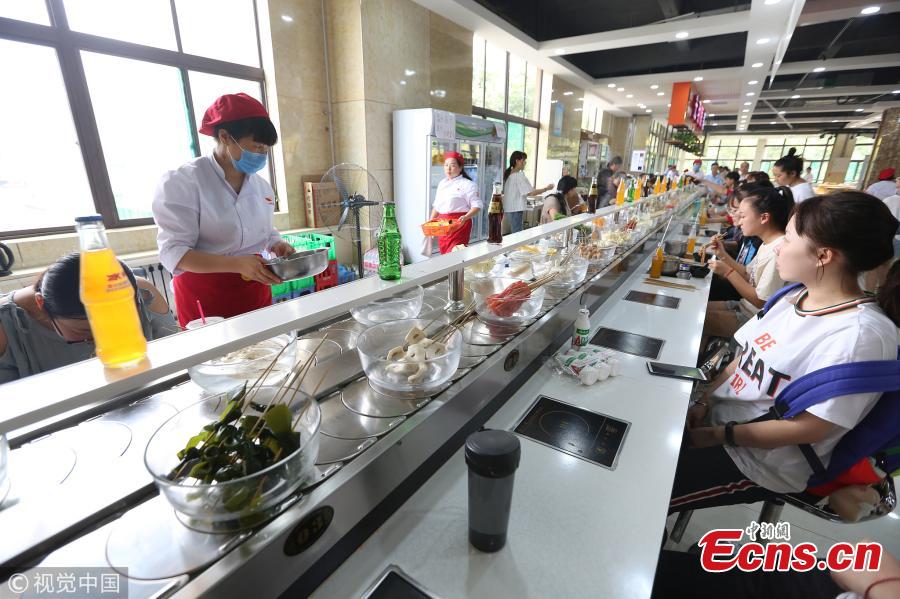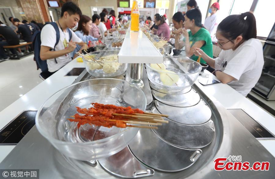 Photo taken on Sept. 12, 2018 shows a hot pot canteen at the Chang'an Campus of Xi'an University of Finance and Economics in Xi’an City, Northwest China’s Shaanxi Province. The canteen became popular among students for its rotary belt that delivers fresh, cheap ingredients and a variety of flavors. A student said spending 20 yuan can could get a good treat. (Photo/VCG)