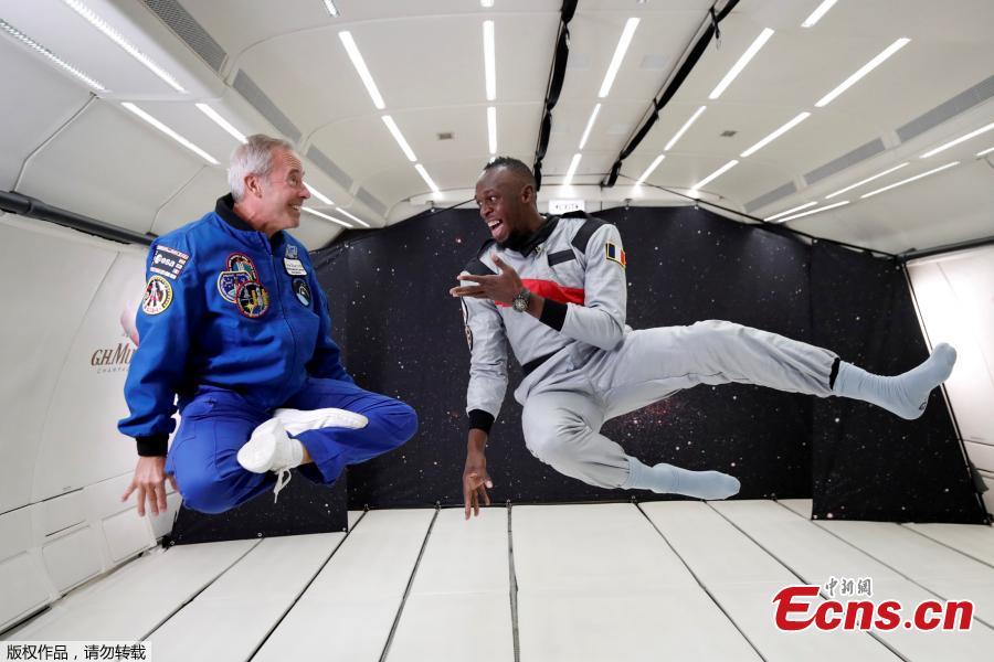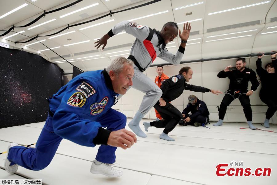 Sprinter Usain Bolt and French astronaut Jean-Francois Clervoy, CEO of Novespace, enjoy zero gravity conditions during a flight in a specially modified plane above Reims, France, Sept. 12, 2018. (Photo/Agencies)