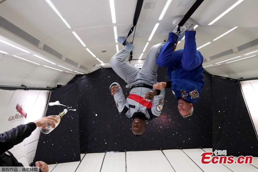Sprinter Usain Bolt, French astronaut Jean-Francois Clervoy, CEO of Novespace and French Interior designer Octave de Gaulle who designed a bottle of "Mumm Grand Cordon Stellar" enjoy zero gravity conditions during a flight in a specially modified Airbus Zero-G plane above Reims, France, Sept. 12, 2018. (Photo/Agencies)