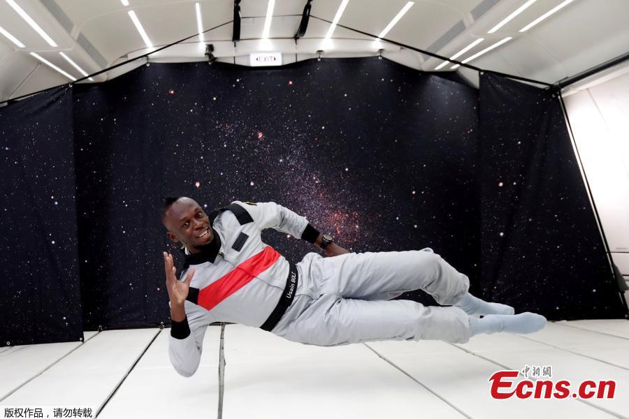 Sprinter Usain Bolt poses as he enjoys zero gravity conditions during a flight in a specially modified plane above Reims, France, Sept. 12, 2018. (Photo/Agencies)
