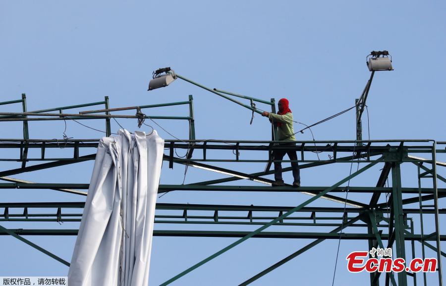 A worker adjusts a spotlight of an advertising billboard along main road EDSA in preparation for the coming of Super Typhoon Mangkhut before it hits the main island of Luzon, in Quezon City, Metro Manila, Philippines, Sept. 12, 2018. (Photo/Agencies)