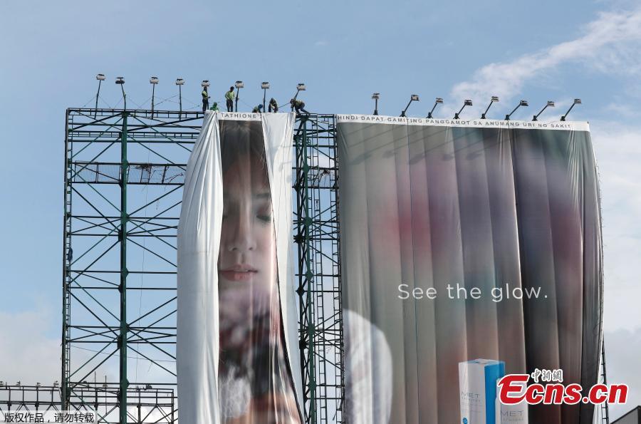 Workers roll advertising billboards along main road EDSA in preparation for the coming of Super Typhoon Mangkhut before it hits the main island of Luzon, in Quezon City, Metro Manila, Philippines, Sept. 12, 2018. (Photo/Agencies)