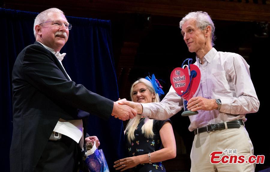 David Wartinger, left, accepts his Ig Nobel award from Nobel laureate Wolfgang Ketterle (physics, 2001) during ceremonies at Harvard University in Cambridge, Mass., Thursday, Sept. 13, 2018. Wartinger won for for using roller coaster rides to try to hasten the passage of kidney stones. (Photo/Agencies)