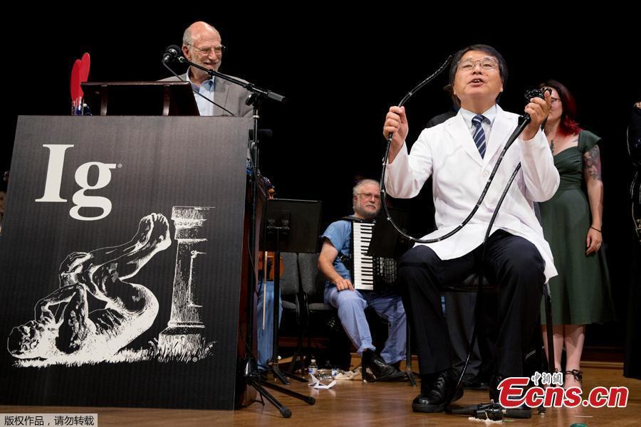 Akira Horiuchi, right of Japan, who won the Ig Nobel in medical education demonstrates his self colonoscopy technic during award ceremonies at Harvard University in Cambridge, Mass., Thursday, Sept. 13, 2018. The annual prize series honors 10 comical but practical scientific studies "that first make people laugh, and then make them think." The prize is run by Annals of Improbable Research (AIR), an international scientific humor magazine (Photo/Agencies)