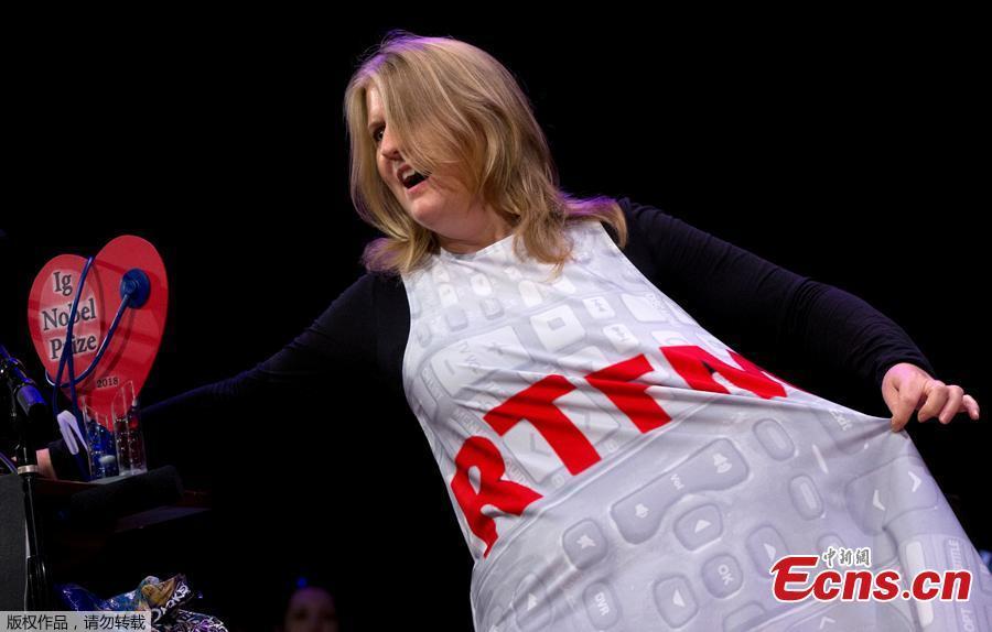 Thea Blackler speaks after receiving the Ig Nobel award in literature during ceremonies at Harvard University in Cambridge, Mass., Thursday, Sept. 13, 2018. Blackler and her team won for finding that people who buy high tech products really can't be bothered with the instruction manual. (Photo/Agencies)