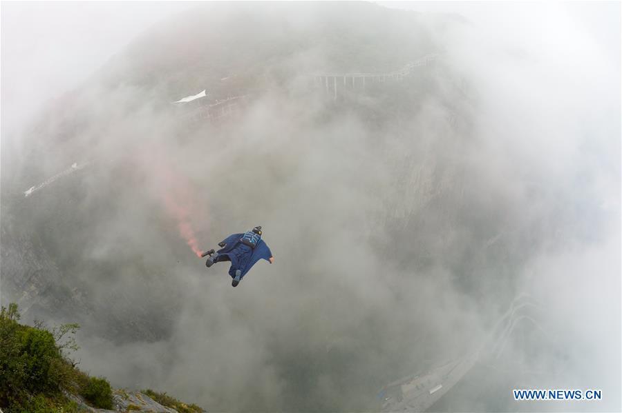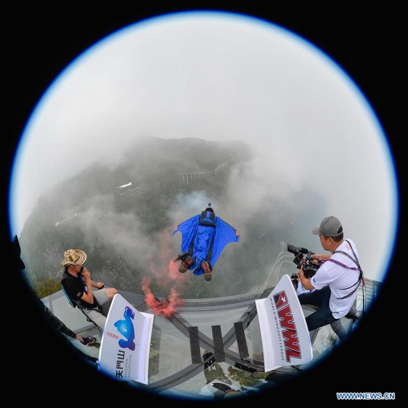 Sven Ugua of Belgium competes during the World Wingsuit League China Grand Prix in Zhangjiajie, central China's Hunan Province, Sept. 15, 2018. (Xinhua/Zhang Xiaoyu)