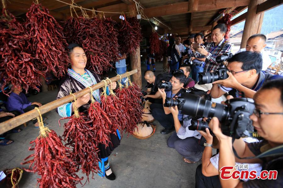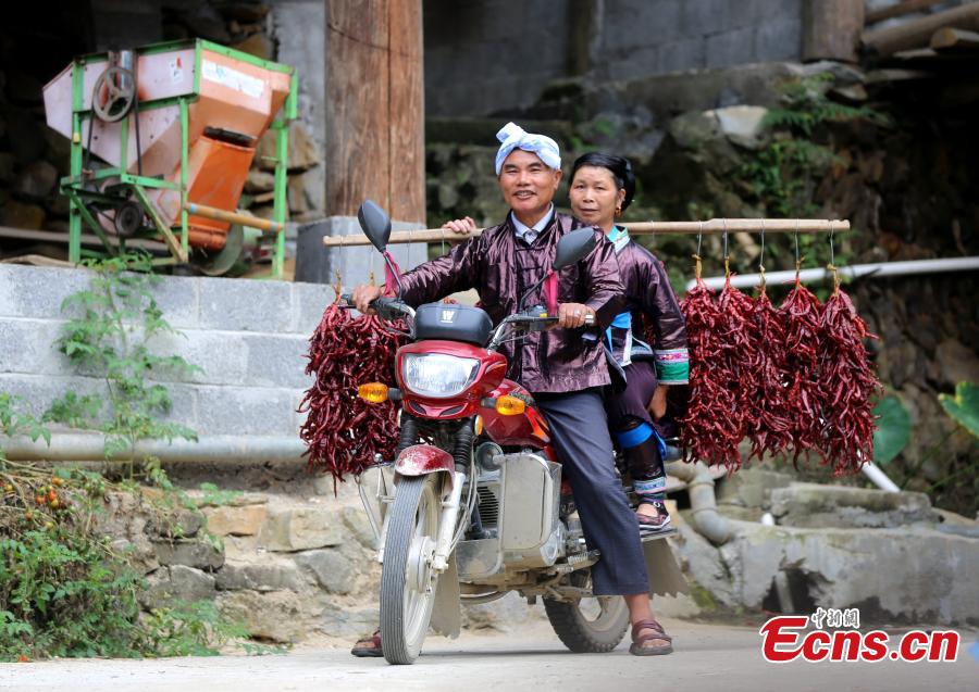 A pepper contest is held at a Miao village in Rongshui Miao Autonomous County, Southwest China’s Guangxi Zhuang Autonomous Region, Sept. 16, 2018. More than 40 Miao women brought their own peppers to participate in the contest to select the best one. Pepper planting has become an important industry for poverty alleviation in the village. (Photo: China News Service/Shi Feng)