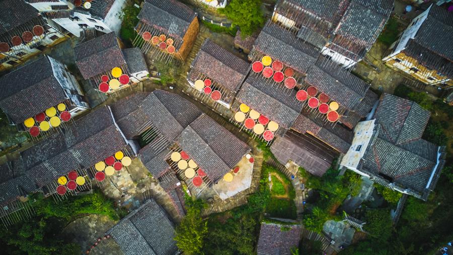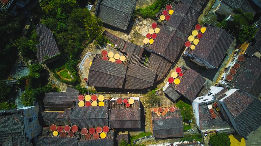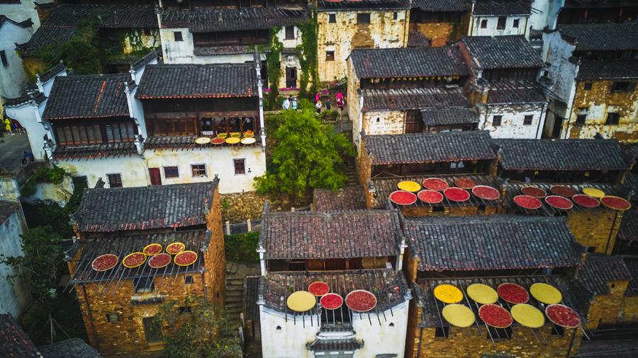Local residents of Huangling village in Wuyuan county, East China's Jiangxi province, fill their bamboo trays with red chilis, chrysanthemum, corn and tea for air drying and winter storage. This ancient agricultural custom incidentally creates a beautiful scene.