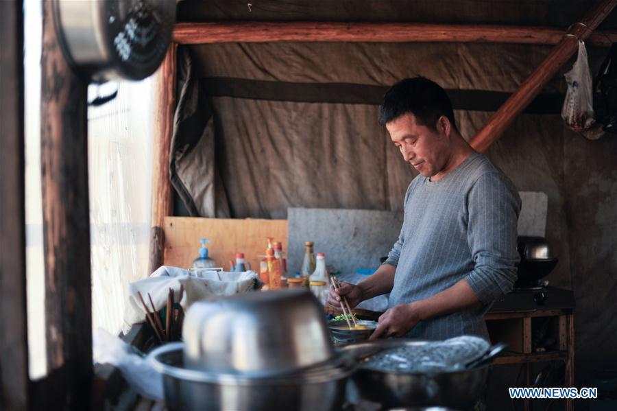 Forester Wang Liang prepares lunch in Yue'anli Forest Farm of Genhe forestry bureau in the Greater Khingan Mountains of north China's Inner Mongolia Autonomous Region, Sept. 18, 2018. Staff members at Yue'anli Forest Farm are responsible for the conservation and breeding work of reindeer in China. (Xinhua/Yu Yang)