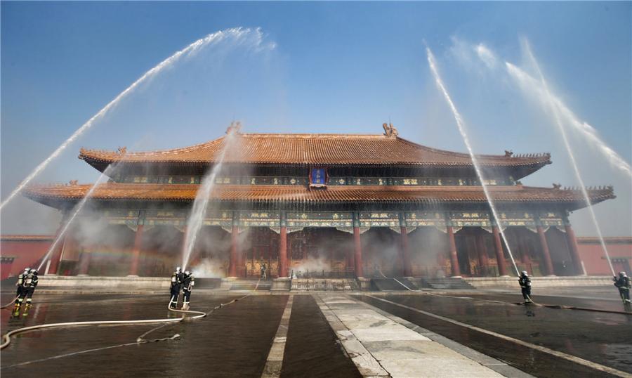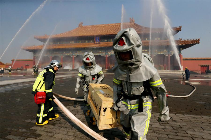 Drills are staged frequently at the Palace Museum in Beijing, where a team is stationed by the east gate to keep watch for fire in turn 24 hours a day. (Photo/CHINA DAILY)