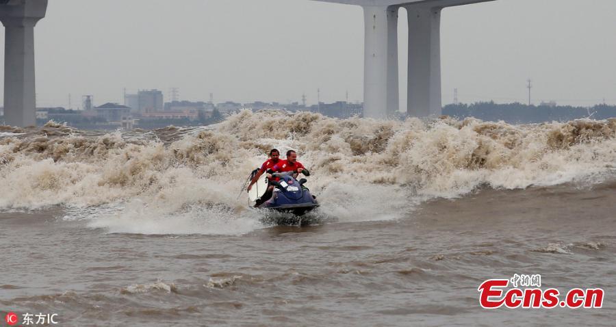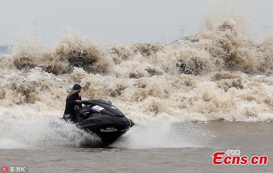 A jet ski on the Qiantang River in Hangzhou City, East China’s Zhejiang Province, Sept. 26, 2018. More than 100 participants from 11 countries including China, Spain, Australia, the United States, South Africa, Brazil, France and Indonesia participated in the surfing competition. The tidal bores on the river have become a popular tourist attraction in China. (Photo/IC)