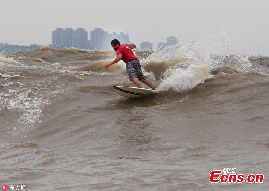 A surfer rides a wave on the Qiantang River in Hangzhou City, East China’s Zhejiang Province, Sept. 26, 2018. More than 100 participants from 11 countries including China, Spain, Australia, the United States, South Africa, Brazil, France and Indonesia participated in the surfing competition. The tidal bores on the river have become a popular tourist attraction in China. (Photo/IC)