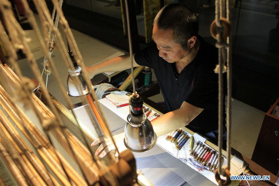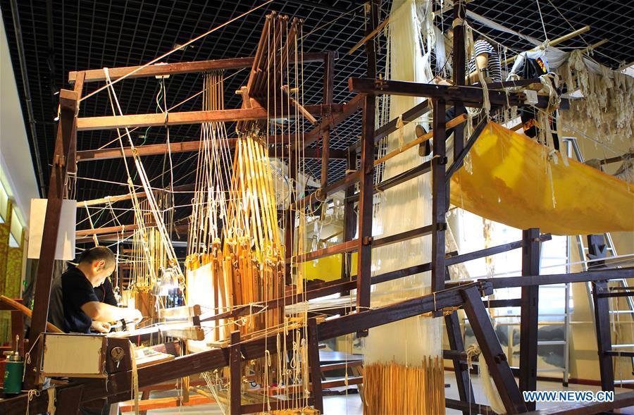 A weaver knits Yun brocade at the Nanjing Yunjin Museum in Nanjing, capital of east China's Jiangsu Province, Sept.26, 2018. Yunjin, also called Yun brocade, is traditional Chinese silk brocade made in Nanjing of Jiangsu. Dated from the Eastern Jin Dynasty, it has formed its own characteristics through its development of 1,600 years. Yun brocade is famous for its exquisite craft, elegant patterns and smooth texture, and the making of the artwork requires close cooperation of two weavers, who can produce only five centimeters a day. In 2009, Yun brocade was inscribed on the Representative List of the Intangible Cultural Heritage of Humanity. (Xinhua/Sui Xiankai)
