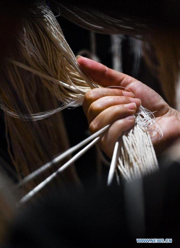 A weaver shows skills of knitting Yun brocade at the Nanjing Yunjin Museum in Nanjing, capital of east China's Jiangsu Province, Sept.26, 2018. Yunjin, also called Yun brocade, is traditional Chinese silk brocade made in Nanjing of Jiangsu. Dated from the Eastern Jin Dynasty, it has formed its own characteristics through its development of 1,600 years. Yun brocade is famous for its exquisite craft, elegant patterns and smooth texture, and the making of the artwork requires close cooperation of two weavers, who can produce only five centimeters a day. In 2009, Yun brocade was inscribed on the Representative List of the Intangible Cultural Heritage of Humanity. (Xinhua/Li Xiang)