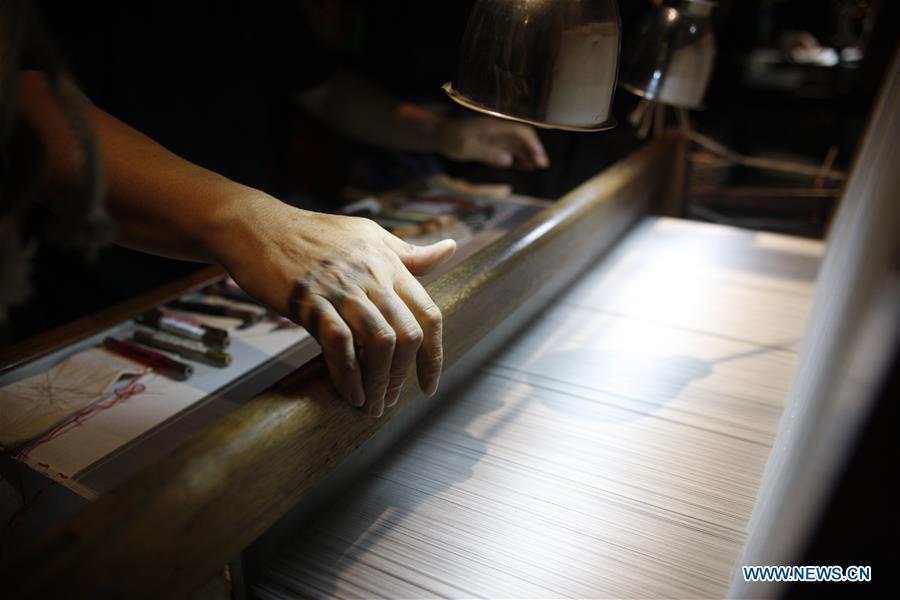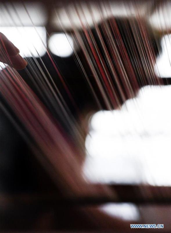 A weaver knits Yun brocade at the Nanjing Yunjin Museum in Nanjing, capital of east China's Jiangsu Province, Sept.26, 2018. Yunjin, also called Yun brocade, is traditional Chinese silk brocade made in Nanjing of Jiangsu. Dated from the Eastern Jin Dynasty, it has formed its own characteristics through its development of 1,600 years. Yun brocade is famous for its exquisite craft, elegant patterns and smooth texture, and the making of the artwork requires close cooperation of two weavers, who can produce only five centimeters a day. In 2009, Yun brocade was inscribed on the Representative List of the Intangible Cultural Heritage of Humanity. (Xinhua/Li Xiang)