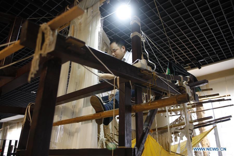 A weaver shows skills of weaving Yun brocade at the Nanjing Yunjin Museum in Nanjing, capital of east China's Jiangsu Province, Sept.26, 2018. Yunjin, also called Yun brocade, is traditional Chinese silk brocade made in Nanjing of Jiangsu. Dated from the Eastern Jin Dynasty, it has formed its own characteristics through its development of 1,600 years. Yun brocade is famous for its exquisite craft, elegant patterns and smooth texture, and the making of the artwork requires close cooperation of two weavers, who can produce only five centimeters a day. In 2009, Yun brocade was inscribed on the Representative List of the Intangible Cultural Heritage of Humanity. (Xinhua/Sui Xiankai)